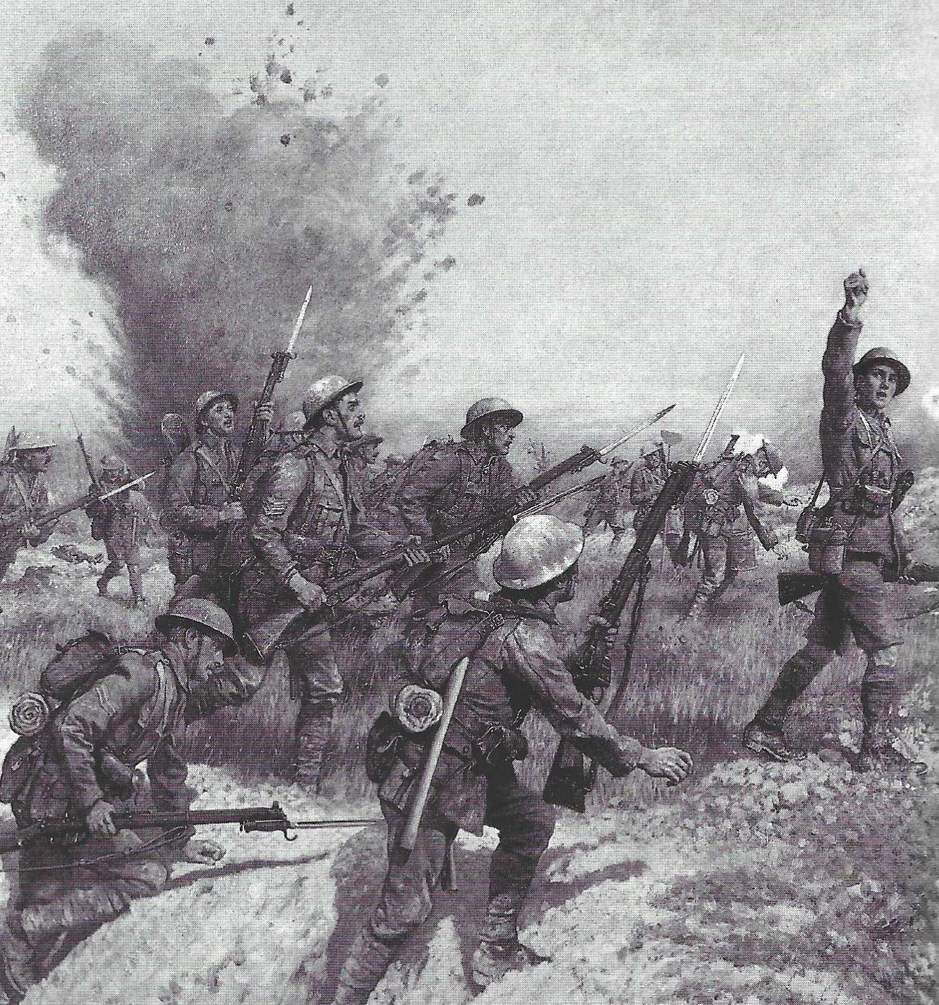 At 7.10am, just before the bombardment reached its crescendo, the first wave of the 36th entered no-man’s land. Unlike other divisions which advanced in lines, the 36th sent its men forward in small groups to penetrate more effectively the breaks in the barbed wire caused by the shelling. No other British unit went over the top until the bombardment actually finished. These tactics, in conformity with contemporary French practice, gave the German defenders the minimum amount of time to respond and long lines of advancing men were not hindered by the lines of barbed wire.