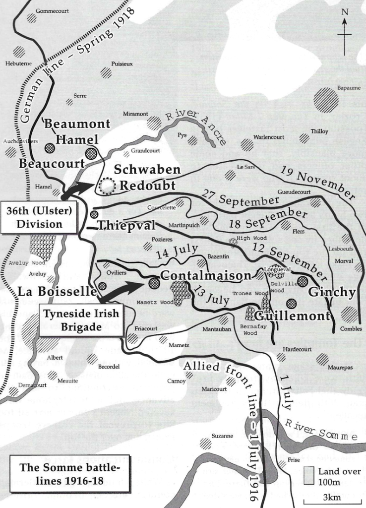 The prevailing impression that only Ulster Protestants took part in the long-awaited ‘big push’ on 1 July 1916 is called into question by the participation of other Irish infantry units. The 1,000-strong battalion (at full strength), subdivided into companies and platoons, was at this time the basic administrative unit of the British infantry. There were four battalions in a brigade and three brigades in a division. In addition to the twelve battalions of the 36th (Ulster) division, were four battalions of Tyneside Irish (the 103rd brigade of the 34th division)—all ‘new army’—and seven regular Irish battalions distributed in other divisions, a total of twenty-three Irish infantry battalions in all.
