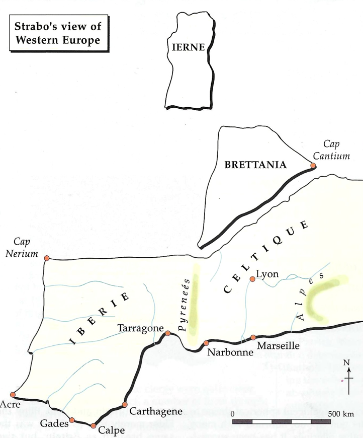 The first Roman writer to refer to Ireland is Julius Caesar, in his account of his campaigns in Gaul, which was probably published around 50 BC. Caesar considered Ireland to be two-thirds the size of Britain, from which it was separated by a strait of equal width to that between Britain and Gaul. Pliny the Elder merely tells us that it was the same breadth as Britain, but two hundred miles shorter, adding that the shortest route by sea to Ireland was thirty miles. In the period between these two authors, Strabo wrote a vast work of geography on more ethnographical lines concerning the ‘inhabited world’. He placed Ireland north of Britain, on the limits of the known world, and claimed that it was ‘barely habitable on account of the cold’. (See fig.1) He generously considered the inhabitants