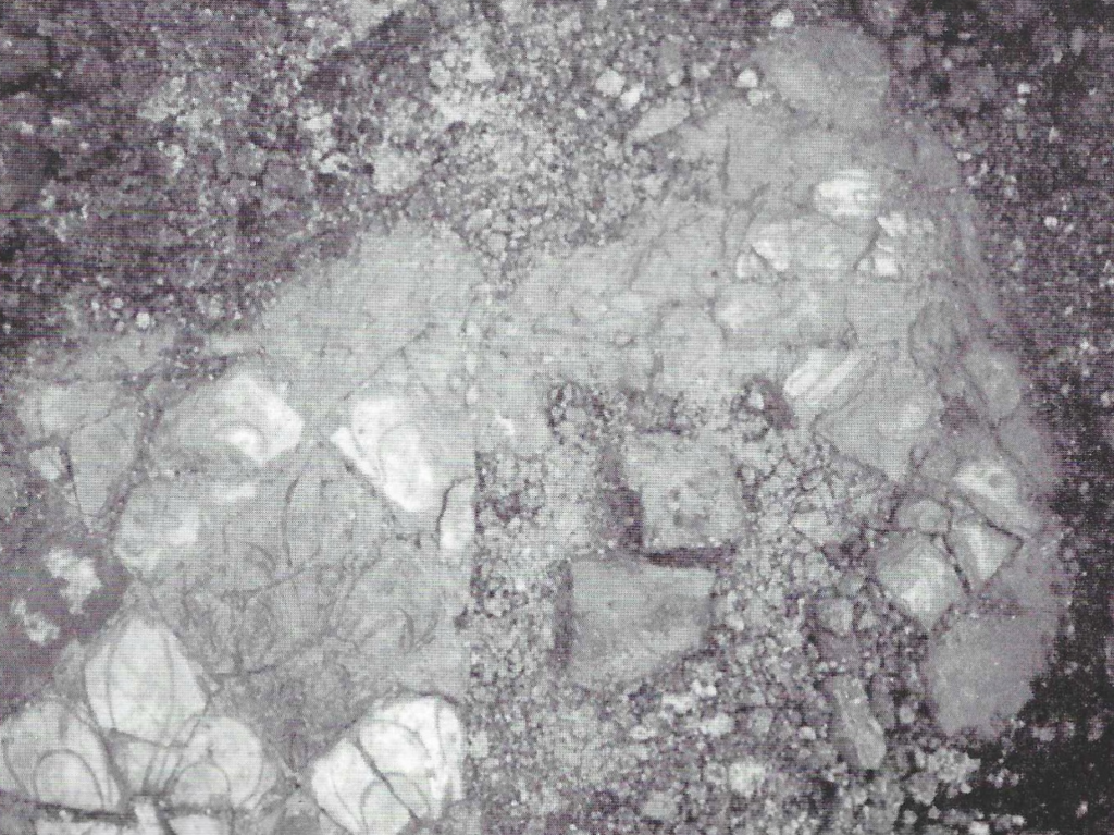 The rapid archaeological work uncovered the south wall of the church, which extends east-west across the entire length of the site. The wall is over 2.75m in width and is faced with dressed limestone blocks, with an infill of lime mortared rubble. A north-south wall, also of medieval date, may delimit the nave and chancel of the church. On the west side of the wall is a floor of closely set smooth cobbles, while on the east two sections of decorated ceramic pavements were uncovered.