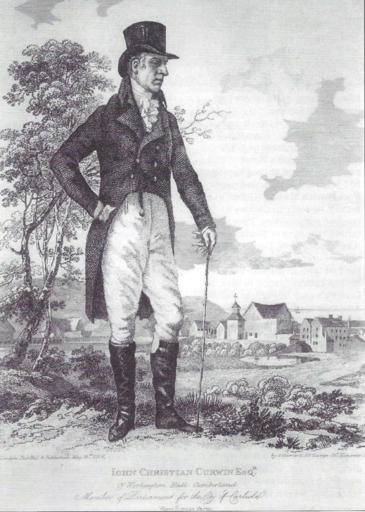 John Christian Curwen (1756-1828) came from a Manx family—he was a first cousin of Fletcher Christian, the mutineer. For the better part of forty years he was MP for Carlisle and Cumberland. Sitting at Westminster with the Whigs he was, until they quarrelled over the French Revolution, a friend of Edmund Burke. He was a pioneering agriculturalist and was awarded the silver medal of the Irish Farming Society.