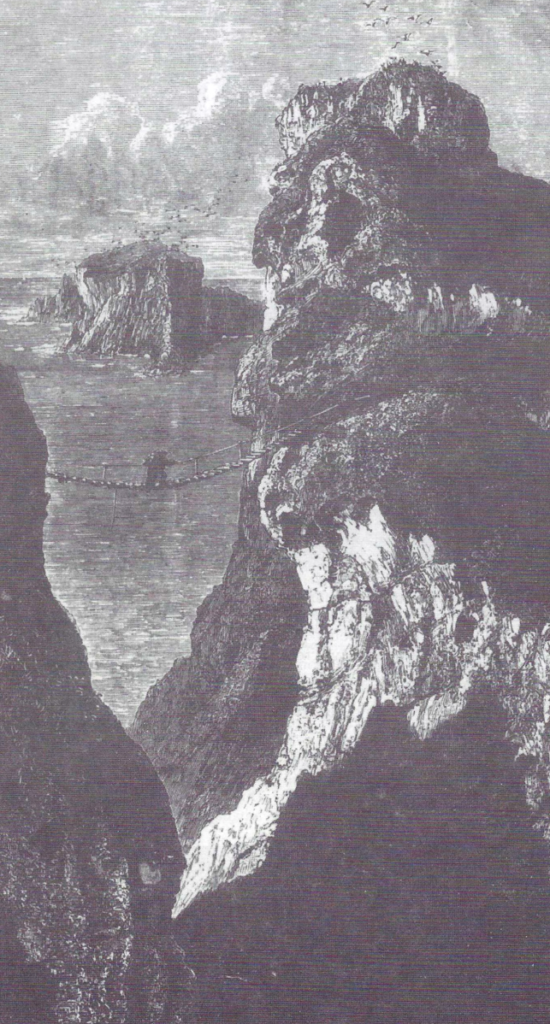 Near the Causeway I was delighted to find a local attraction described by my ancestor—the rope bridge at Carrickarede. The picture of this salmon-fishers’ bridge, swinging precariously sixty or more feet above a narrow chasm of sea, must be familiar to all Irish people, but I was entirely ignorant of its existence. Curwen did not attempt to cross it—he suffered ‘the extreme pain of seeing a man cross it with a child in his arms’. It is only fair to say that there was only one handrail in his day.