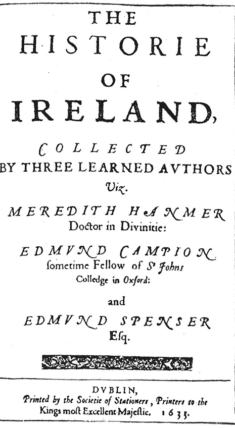 The influence of Ireland upon Spenser’s imagination has come to be more fully recognised in recent years, as has the importance of his long tract, A View of the Present State of Ireland. In this orchestrated dialogue between the fictional Eudoxus and Irenius, Spenser was highly critical not only of Irish life but also of English government policy and Anglo-Irish magnate behaviour. A View, which was probably composed in 1596, had to wait until 1633 before it entered the world of print, when it was published by the eminent antiquarian, Sir James Ware, alongside the more obviously historical works of Edmund Campion and Meredith Hanmer, in The Historie of Ireland.