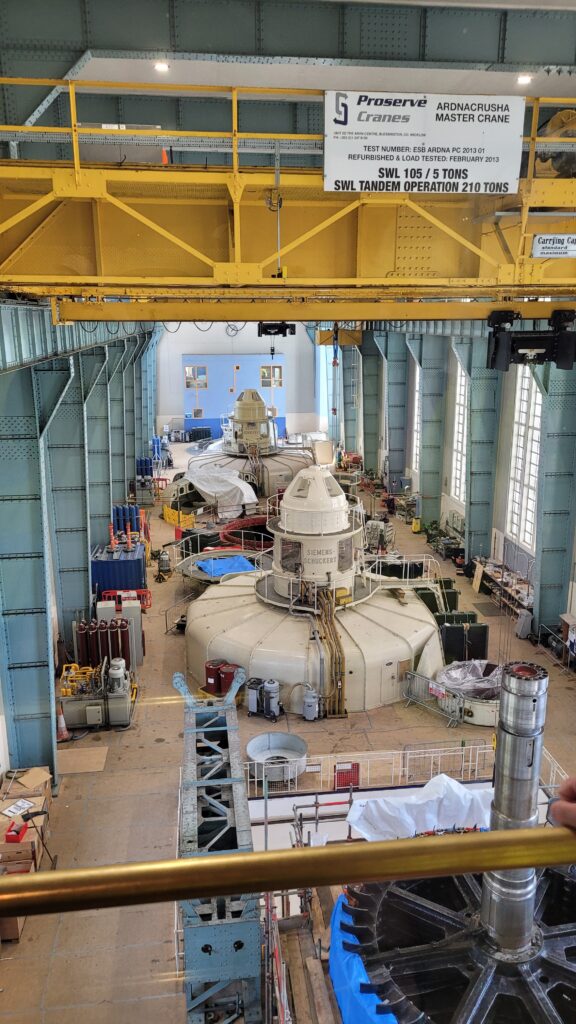 We move outdoors and up 80+ steps. We spread out along the 30m-high dam wall; the head-race canal vista is to our left, stretching 12.6m to Parteen; the massive, heavily bolted penstocks, 4m x 6m wide and 41m long, slant down 32m to our right. Ahead is a boat channel with a double-chambered lock that drops 34m, one of the deepest canal locks in the world. To the front are the fish lifts (for salmon returning to spawn), a series of cylindrical cages. The adjacent ramps with bushy bristles are elver (baby eel) escalators to move them upstream. South-west is the rushing tail-race, where the water is disgorged from the turbines.