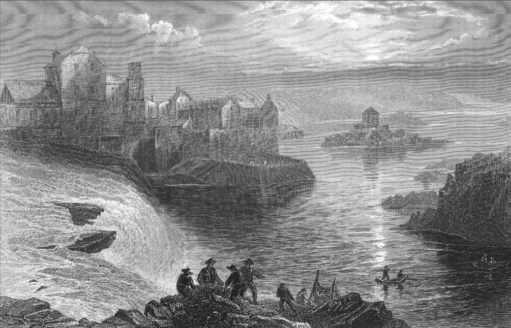 Angela Byrne comments that from the mid-eighteenth century the salmon leap at Assaroe Falls, dramatically illustrated in J.T. Willmore’s 1842 drawing (above), was counted among Ireland’s principal tourist attractions, alongside Wicklow, the Lakes of Killarney and the Giant’s Causeway. The poet William Allingham once wrote that Ballyshannon had a voice of its own, which came from the sound of the falls. That voice was silenced in the 1940s with the building of a hydroelectric station, which involved narrowing the river and removing the falls. A short-term boon to the town (and a long-term benefit for the country), the project damaged valuable fishing grounds and destroyed a lucrative tourist attraction.