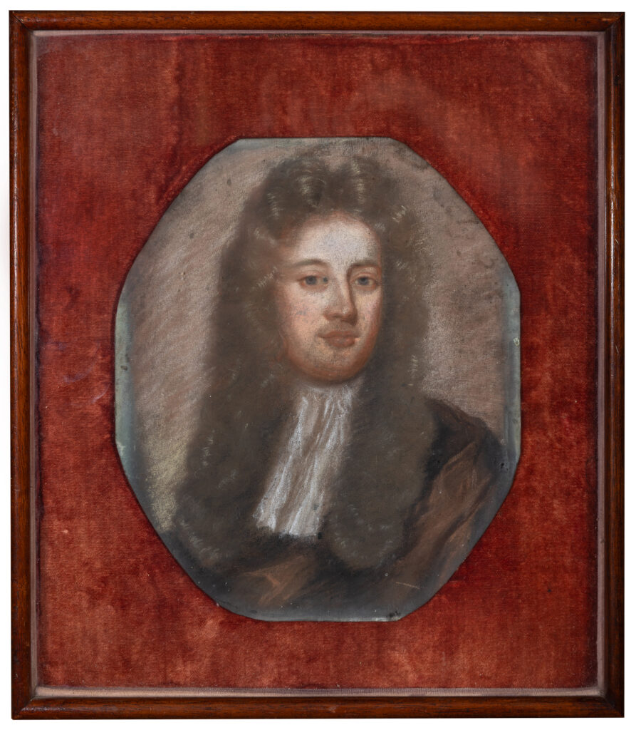 Edward Luttrell (c. 1650–1737) was a British artist noted for pioneering the use of pastels on prepared copper plates. This innovative technique, which he began using around 1680, combined his skills in pastel portraiture and mezzotint engraving. Luttrell wrote a manuscript in 1683—‘Epitome of painting, containing breife directions for drawing, painting, limning and cryoons’—which detailed his pastel techniques, including recipes for pastels and methods of mixing pigments. The painting has been authenticated by Neil Jeffares, author of the Dictionary of pastellists before 1800, and is attributed to Luttrell in the online edition. On the verso there is a handwritten reference to W.R. Haliday, who could be Lt. Col. William Robert Haliday (1809–78) of Clifden, near Holywood, Co. Down, who came from a medical family long established in that area. The Haliday family, like the Montgomerys and Campbells, had come to Ireland from Scotland.
