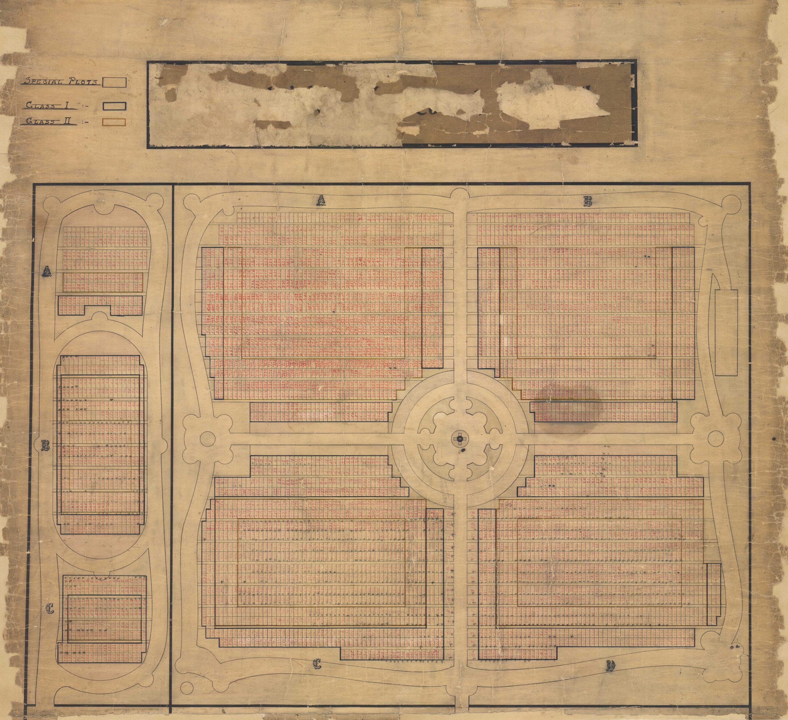 The collection also contains a wonderful map of the cemetery (p. 52), showing the graveyard’s sections and a colour outline on blocks of graves, indicated by the map’s legend as special plots, class I plots and class II plots, with every grave thereon numbered. Sadly, its title, ‘St Patrick’s Cemetery, Dundalk’, has almost disappeared, with the wording’s outline now barely visible. It was drawn by James Gaskin CE, whom the board had appointed as architect in 1891. Rule II in the 1888 Regulations stipulated that a map of the burial-ground be kept ‘in some convenient place at or near the burial-ground’ and that ‘every grave-space shall be shown with its distinctive mark inscribed thereon’.