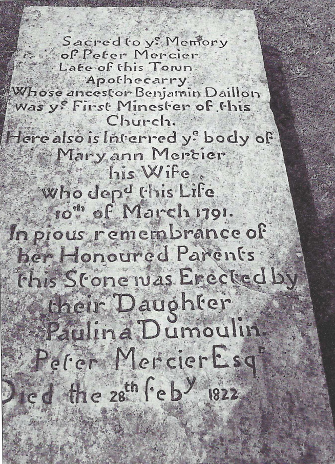 In the church Pasteur Benjamin de Daillon celebrated his liturgy. Before his escape from France he had been on the run, imprisoned once in the Conciergerie de Paris, saying his services in secret rooms, hiding in the hills. Now the local Catholic clergy were condemed to a similar predicament but fate had a final twist in store for de Daillon. In 1702 as part of the Act recognising de Ruvigny’s leases, control of revenue was vested with Bishop Moreton of Kildare, and he insisted that de Daillon be re-ordained and follow the rites of the Church of Ireland. The Huguenot Calvinists throughout Ireland proved much easier to bring into conformity than the Scots. De Daillon, though, would not have it, and left with a small following of mostly the non-noble population.