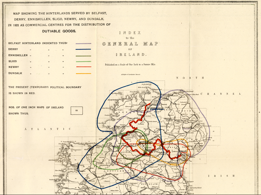 Above: A map produced by the Irish government in 1923, showing how the border cut through the natural economic hinterlands of many places from north Galway to Donegal.