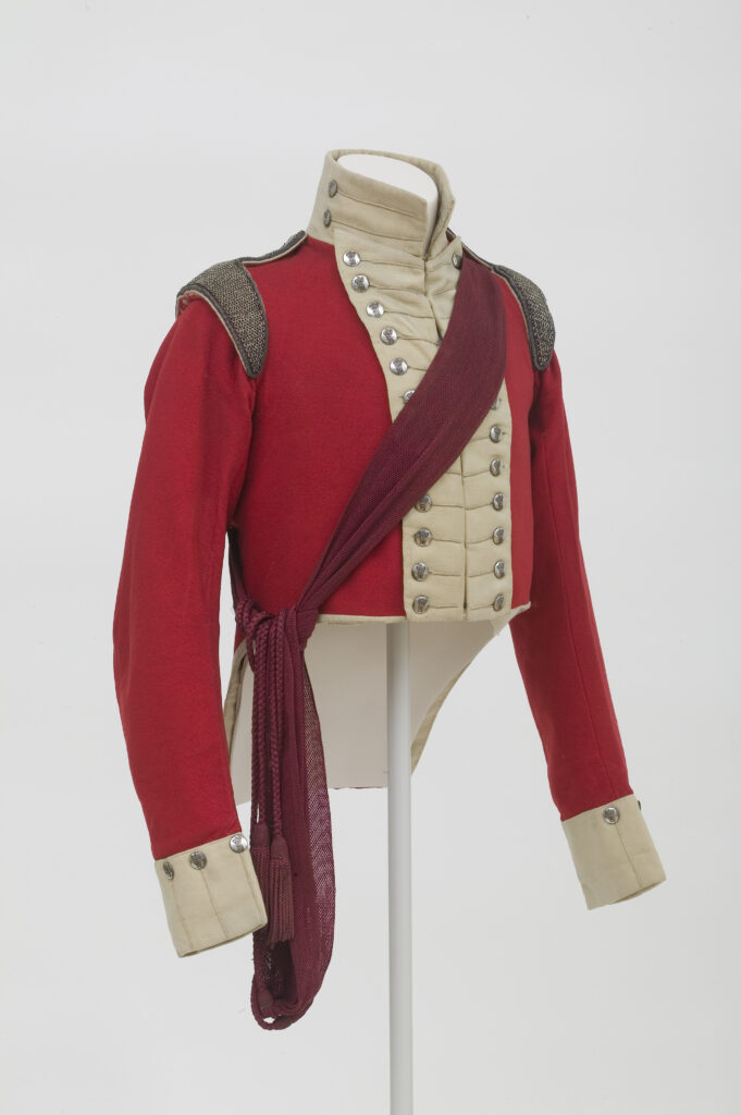 While there are captured French trophies from the war in the many British Army regimental museums, objects reflecting Irish soldiers who fought in Spain are rare, although there are more items exhibiting the experience of Anglo-Irish officers. Among these was John Millet Hammerton, Co. Tipperary (above/below), who led the 44th Foot (the East Essex) at the Battle of Waterloo. In 1810 this regiment was fully Irish, with 91% of its troops born in Ireland. Another was Archibald Armstrong of Tullymore, Co. Sligo, who wore this uniform (above/below) as a captain in the 71st (Glasgow Highland) Light Infantry during the Peninsular War. Despite the name, the Glasgow Highlanders did not wear kilts but trousers, and 34% of this regiment were Irish-born.