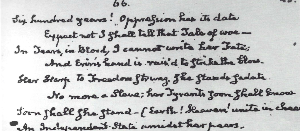 For Quincy Adams the origins of ‘Erin’s wrongs’ lay in its conquest by Henry II aided and abetted by the ‘unprincipled ambition’ of Diarmait Mac Murchada—’a transaction…of melancholy depravity’—which could not have been accomplished ‘but by a complication of the most odious crimes, public and private’. Motivated by the belief that the conquest of Ireland ‘had sunk into a mere incident in the annals of England, scarcely known or noticed by the general readers of history’ he sought through the medium of his epic poem to relate Ireland’s plight and to encourage her to stand ‘an independent State amidst her peers’.