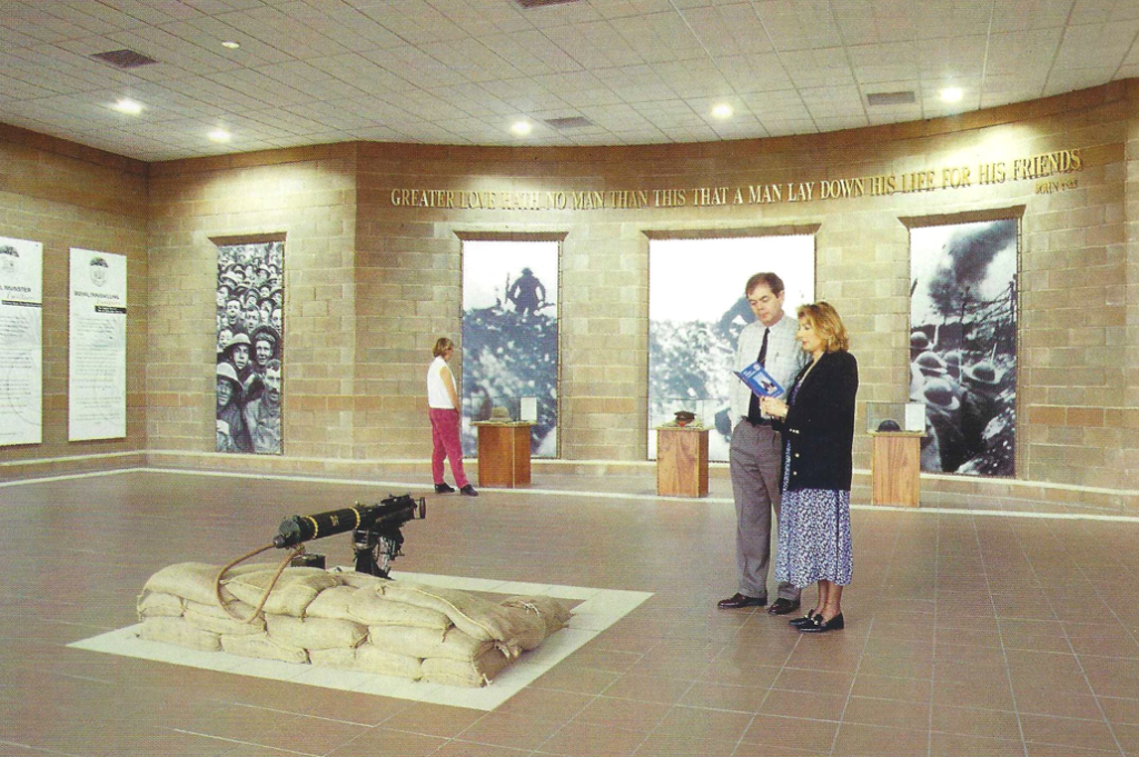 What is immediately apparent to the visitor entering the large and sparsely furnished entrance lobby is the religious aura which has enveloped the events remembered here. The bare stone floor, the large photo mural of the Ulster Tower at Theipval, the biblical inscription from the Gospel of St John—’Greater love hath no man than this, that a man lays down his life for his friends’—which is located above the main wall. The presentation of three display cabinets containing personal artefacts, Flanders poppies and the soil from foreign battlefields also help to establish this as a place of solemn remembrance. In this context they act as a frame within which the presentation of the past is effected and leave little room for doubt that important political and moral issues are at stake.