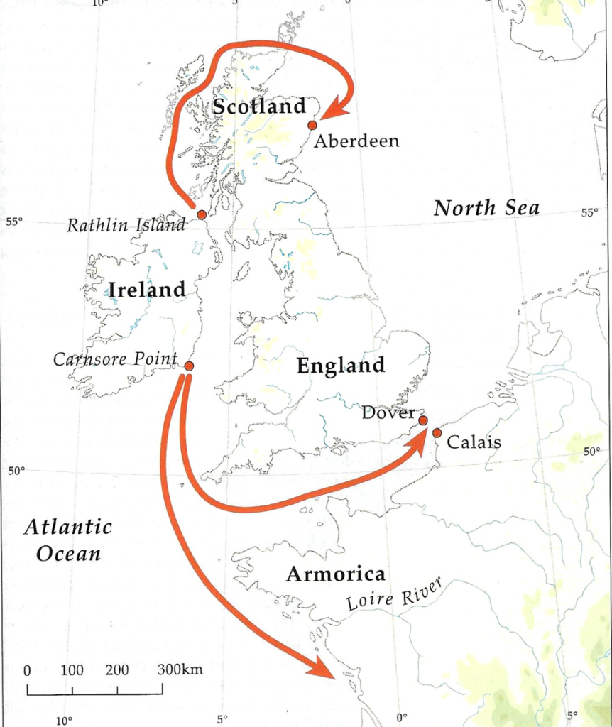 If it set out from the vicinity of Rathlin island in the north east of Ireland under these circumstances, it could have reached the environs of Aberdeen in Scotland. If it had started from Carnsore Point in the extreme south east, and sailed into the English Channel, it could have travelled as far as Dover on the south coast of England or Calais on the opposite side of the Channel. On the other hand, if it had sailed south, it could have passed the mouth of the Loire on the west coast of France (Map). These distances provide the outer possible limits of Patrick’s journey. However, it is highly improbable that the boat would have encountered winds and currents in its favour at all times; therefore, the actual distance achieved was likely to have been much less.