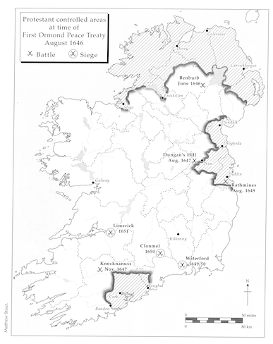 With the outbreak of civil war in England during the summer of 1642, government forces in Ireland split into royalist and parliamentarian factions, while the Scots covenanters, allies of the English parliament, sent a large army to Ulster to protect their own settler interest. For the next three years, despite the large number of troops in the country, the fighting was confined to minor skirmishes, sieges and supply raids, with no one side gaining a decisive advantage. This sporadic warfare was accompanied by almost continuous negotiations between the confederates and the royalists, led by the protestant lord lieutenant, James Butler, Earl of Ormond. The confederates, uncomfortable in the role of rebels, were anxious for a reconciliation with the crown and eager to join forces against the king’s ‘real’ enemies, the parliamentarians and the Scots. The contentious issue of religious concessions for Catholics, however, prevented the conclusion of any agreement.