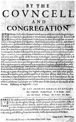 The emergence of the General Assembly as a more active component in political affairs had already begun the previous summer, 1645. After his arrival in Ireland, the Earl of Glamorgan, despite a direct request, had refused to negotiate with the General Assembly and insisted instead on dealing with the Supreme Council. Already resentful of the council’s usurpation of power, the assembly members decided not to allow this public humiliation to go unchallenged. They issued a statement that the confederate union was to stay in place until peace terms had been ratified in a full parliament, not withstanding any declaration to the contrary. This was an unambiguous warning to the council not to conclude any treaty without consultation and is the first indication of the assembly’s willingness to adopt the central role outlined for it in the confederate ‘model of government’.