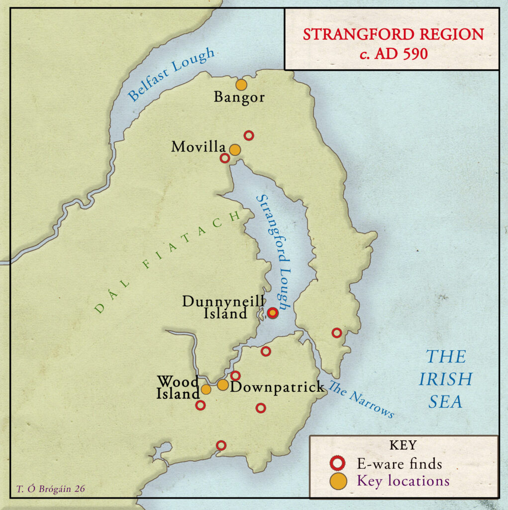 A rendezvous with merchant sailors seems much more likely. Twenty years later, when Columbanus was expelled from Burgundy, the vessel that was supposed to ferry him back to Ireland from Nantes was operating as a trade ship on that route. Maritime trade between Gaul and Ireland in this period is also evidenced by sherds which archaeologists have unearthed of a coarse kitchenware known as ‘E-ware’. Its point of origin has long proved elusive, but recent research points to the Bordeaux region. However, those same finds of E-ware challenge the idea that Columbanus sailed from Bangor. The distribution of the sherds is clustered around Downpatrick, revealing that Gaulish merchants were accessing the north-east of Ireland via Strangford Lough, not Belfast Lough.