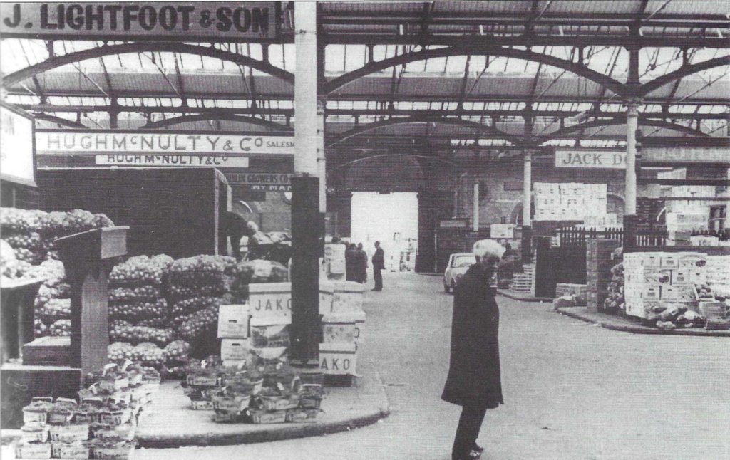 In 1976, An Foras Taluntais noted that ‘ninety-five per cent of the greengrocers of Dublin visited the market daily to buy fruit and vegetables’ and they supplied about half of the retail market. The remainder was supplied by supermarkets (i.e. multiple or ‘chain’ stores, who buy in bulk and do not use the wholesale market).